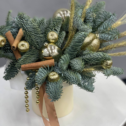 Композиция в шляпной коробке "Золотая сказка" из нобилиса и пшеницы