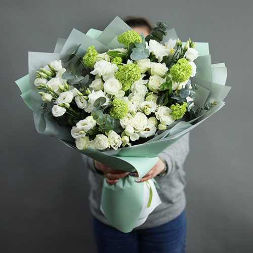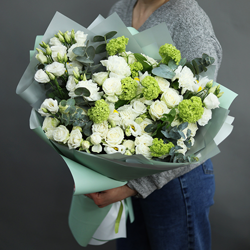 Букет "Мия" из эустом, вибирнума, диантусов и кустовых роз