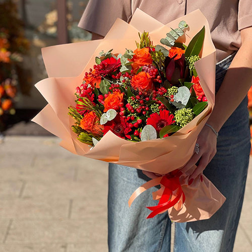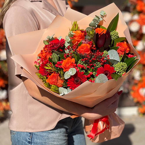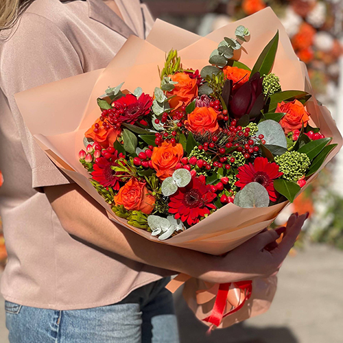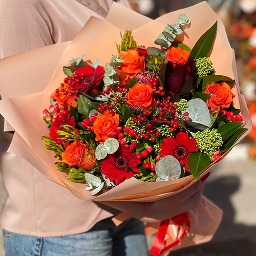 Букет "На заре" из роз, калины, скиммии, гиперикума, сафари, гербер и капса