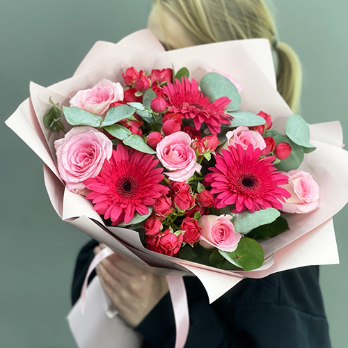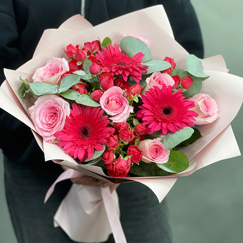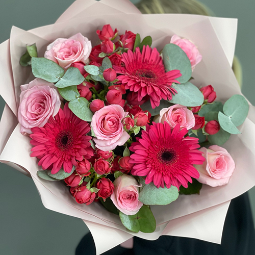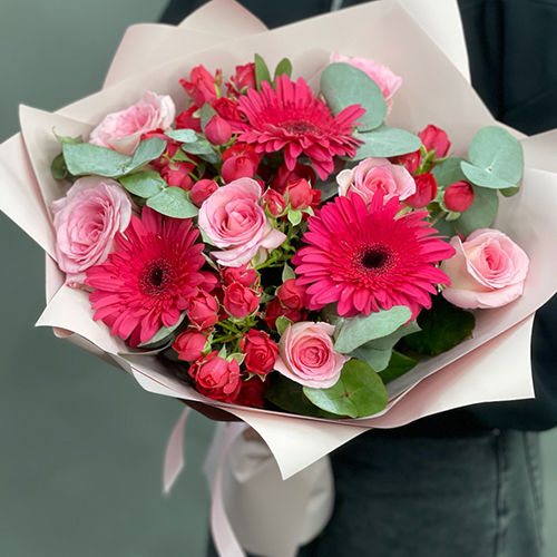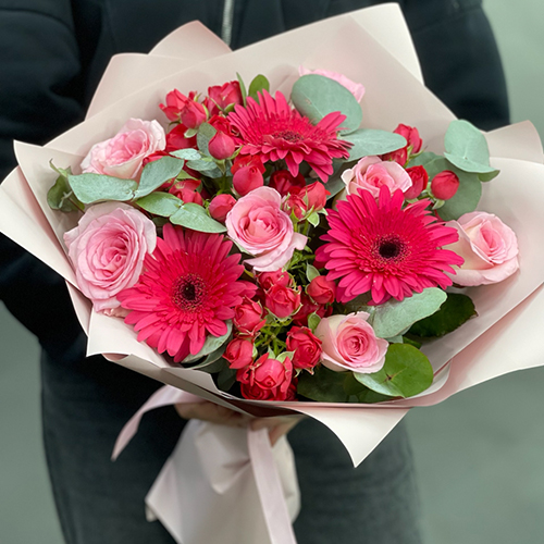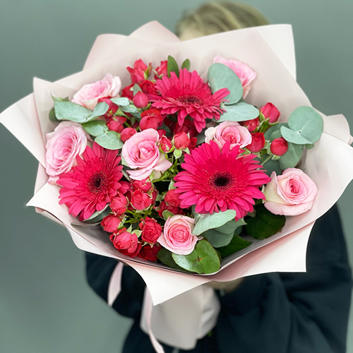 Букет "Маджента" из микса роз, гербер и эвкалипта