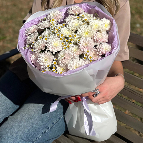 Букет "Нежный взгляд" из кустовых хризантем и ромашек
