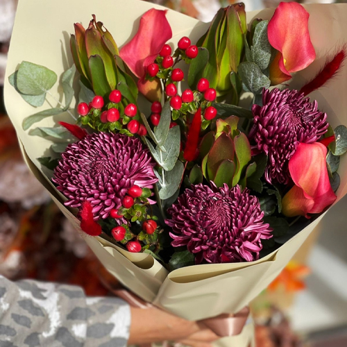 Букет "Элиза" из хризантем Бигоуди, гиперикума, сафари и калл