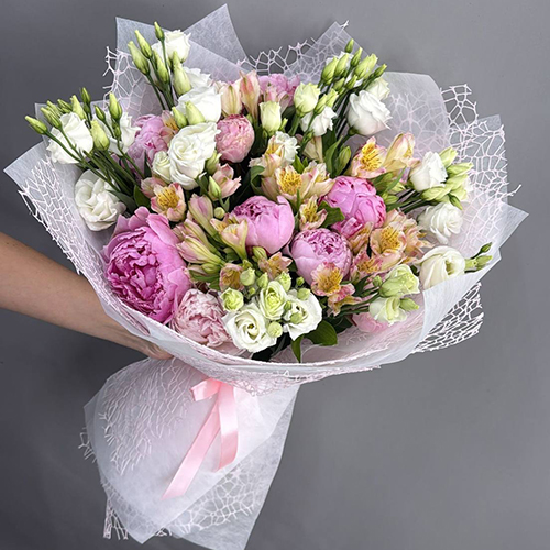 Букет "Луи" из пионов Сара Бернар, розовой эустомы и альстромерии