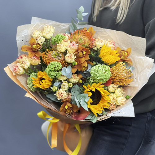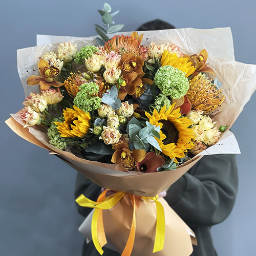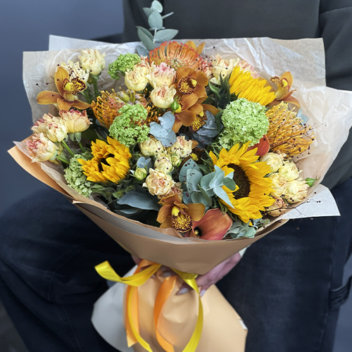 Букет "Сочиняй мечты" из подсолнухов, лейко, вибирнума, орхидей, калл, кустовых роз и талинума