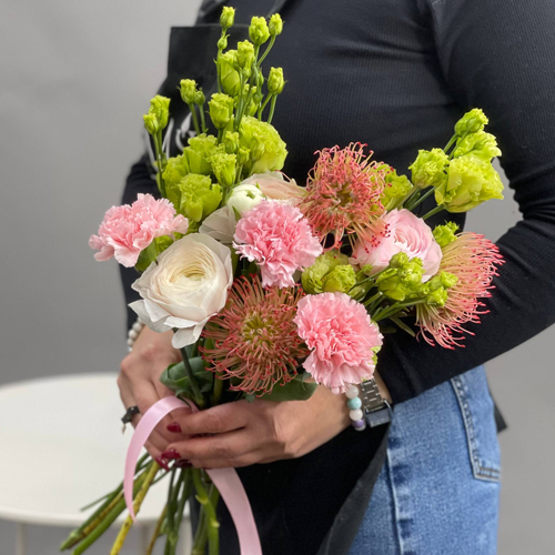 Букет "Фантастический" из ранункулюсов, лейко, эустом и диантусов