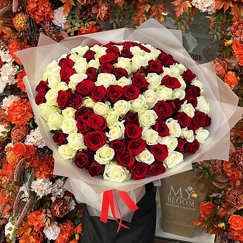 Букет "Выбор сердца" из 127 красных и белых роз (60 см)