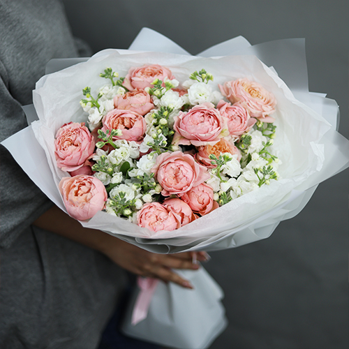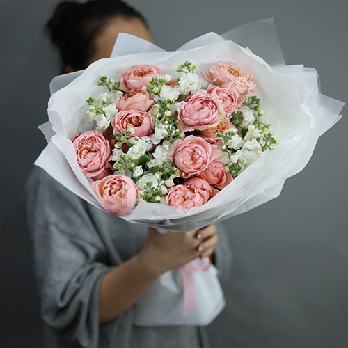 Букет "Наоми" из кустовых пионовидных роз Джульетта и ароматных маттиол