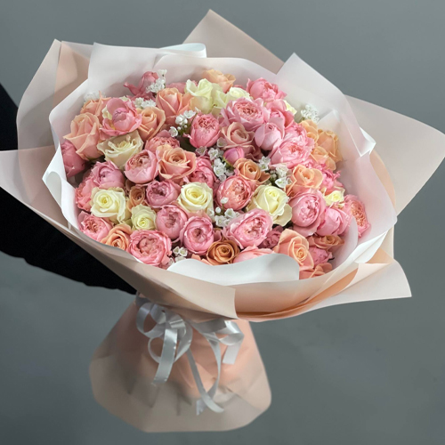 Букет "От моего сердца" из кустовых пионовидных роз Джульетта, аллиума и роз Аваланж