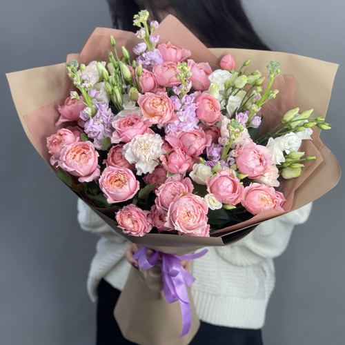 Букет "Лиана" из ароматных маттиол, пионовидных кустовых роз Джульетта, эустом и диантусов
