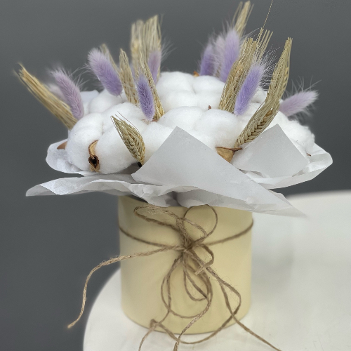 Композиция в шляпной коробке из хлопка, лагуруса и пшеницы (Сухоцвет)