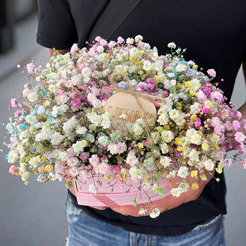 Композиция в коробке сердца из радужных гипсофил с топпером